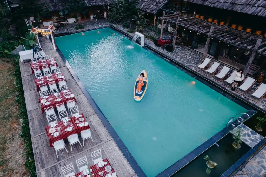 Không gian resort cực kỳ yên tĩnh, xung quanh nhiều cây xanh và hoa cẩm tú cầu. Villa rộng, nội thất gỗ ấm cúng, giường ngủ thoải mái. Hồ bơi sạch, rộng và view đẹp nhìn ra rừng. Điểm cộng lớn là bữa sáng có món ăn địa phương khá ngon.