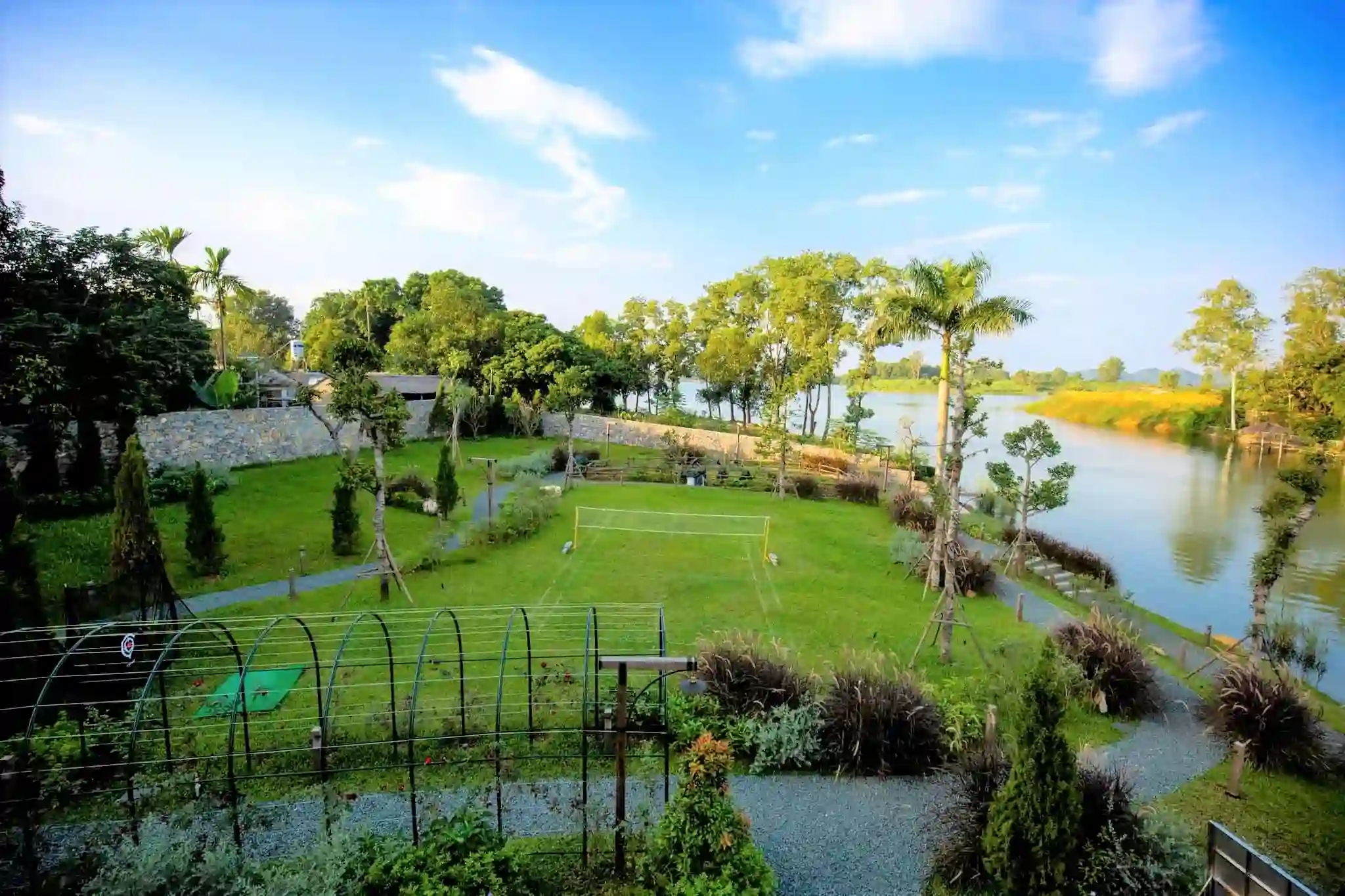 Check-in & Thiên nhiên: Cầu gỗ sát mép hồ tự nhiên, vòm hoa hồng rực rỡ và sân cỏ rộng lớn cho các hoạt động Team Building sôi nổi.