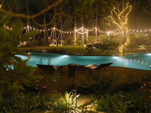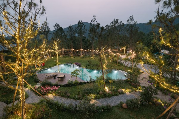 Bể bơi view rừng: Bể bơi rộng 100m2 hướng thẳng ra rừng thông, có sẵn ghế hồ bơi để bạn nằm thư giãn và hít hà khí trời.